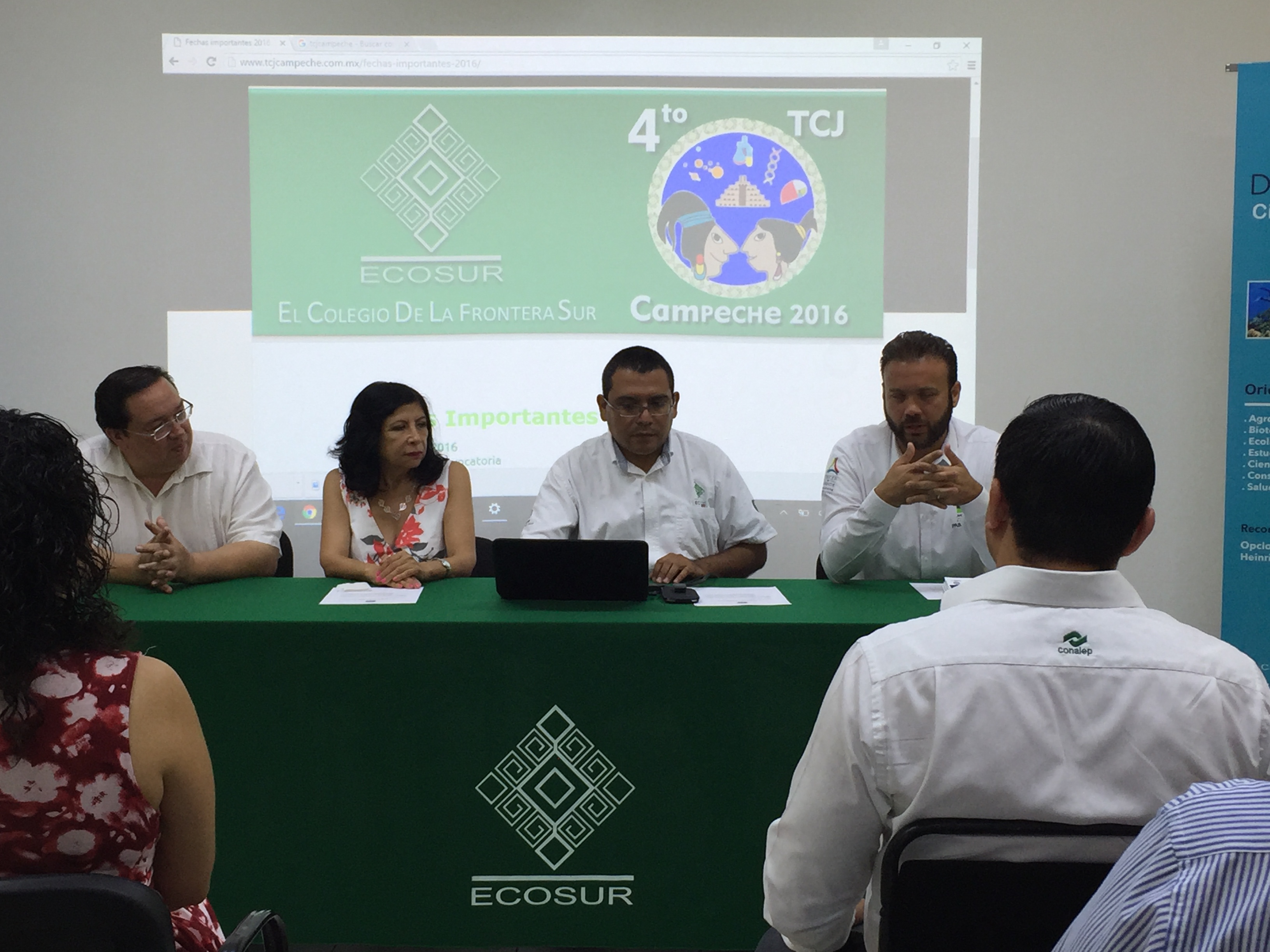 Yuri Jorge Peña Ramírez, investigador del Departamento de Ciencias de la Sustentabilidad de Ecosur y Coordinador del TCJ Campeche; Jorge Esquivel Ruiz, director de la Fundación Pablo García; Nidia Cárdenas, representante de la Fundación Avanza; Carlos Rodríguez Cabrera, Conacyt Campeche y Emilio Lara Calderón, director del Instituto de la Juventud del Estado de Campeche (INJUCAM), en conferencia de prensa, invitaron a los jóvenes a inscribirse y pasar un verano científico.