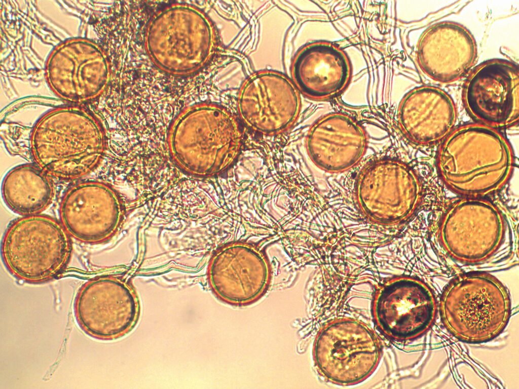 En la fotografía se observan hongos micorrízicos arbusculares, diminutas esporas que se encuentran en el suelo y que establecen una alianza positiva con las raíces de las plantas, en la cual, mejoran la absorción de agua y nutrientes. Estas pequeñas estructuras son una opción para elaborar biofertilizantes y fortalecer la producción sustentable en la agricultura.