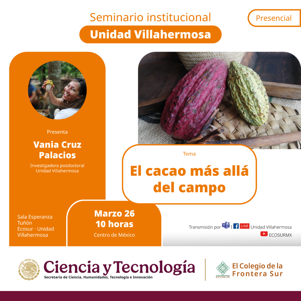Transmisión por Teams, Facebook Live, YouTube + Añadir Google Calendar + iCal / Outlook export 00 días 00 horas 00 minutos 00 segundos Organizador Unidad Villahermosa Fecha Mar 26 2026 Hora 10:00 am - 11:00 am Localización Sala Esperanza Tuñón Pablos, Ecosur Unidad Villahermosa Carretera Reforma Km 15.5, Ra. Guineo 2da. Sección, Villahermosa, Mexico Compartir este evento Categoría EventosSeminario institucional