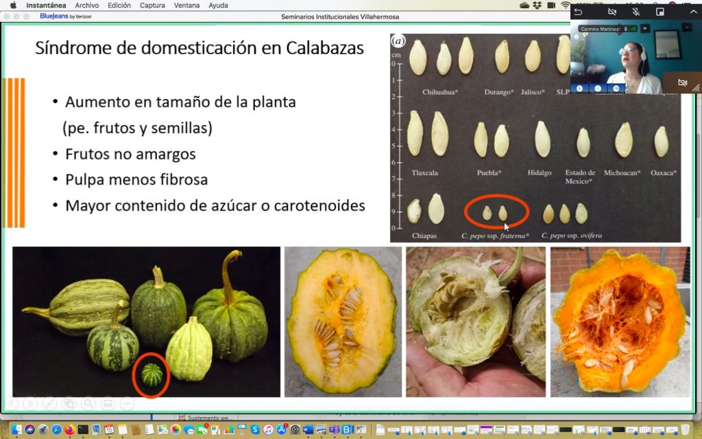 El jueves 15 de julio, la maestra en Ciencias Carmina Martínez Gonzálezse presentó la ponencia “Flujo génico histórico y reciente de cultivos comerciales, tradicionales y taxones silvestres de Cucurbita pepo en México”, en el Seminario Institucional Virtual de la Unidad Villahermosa.