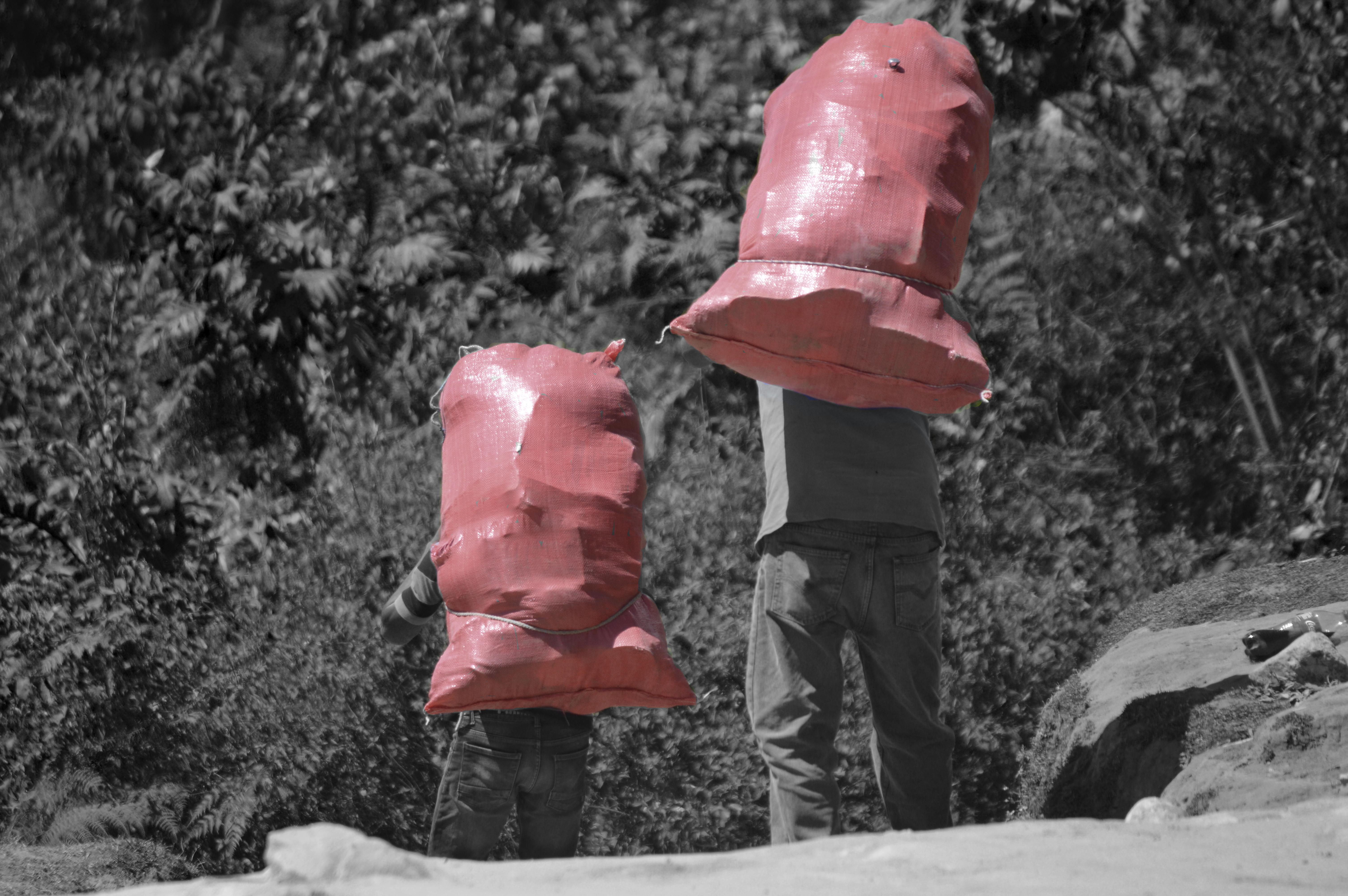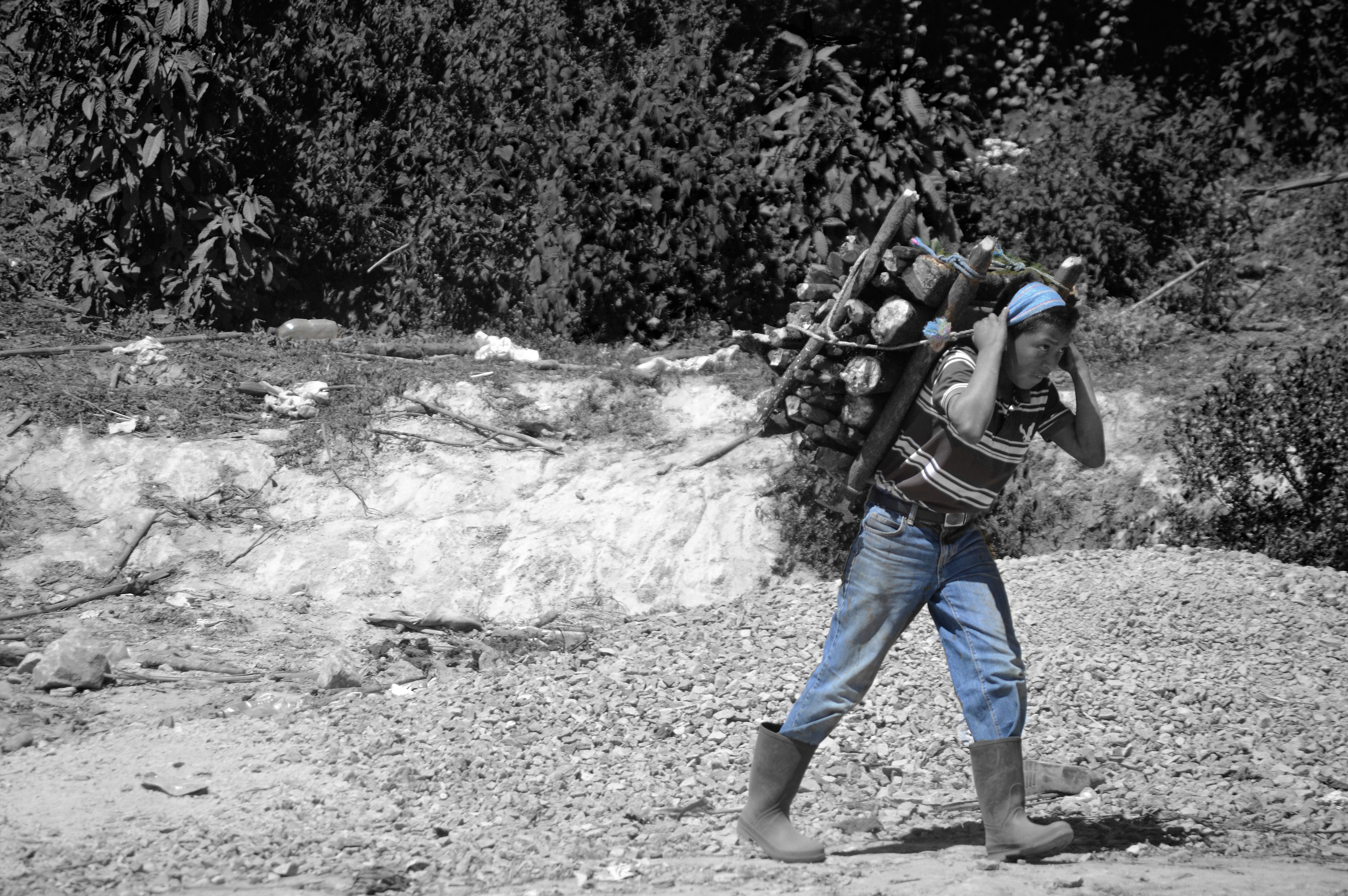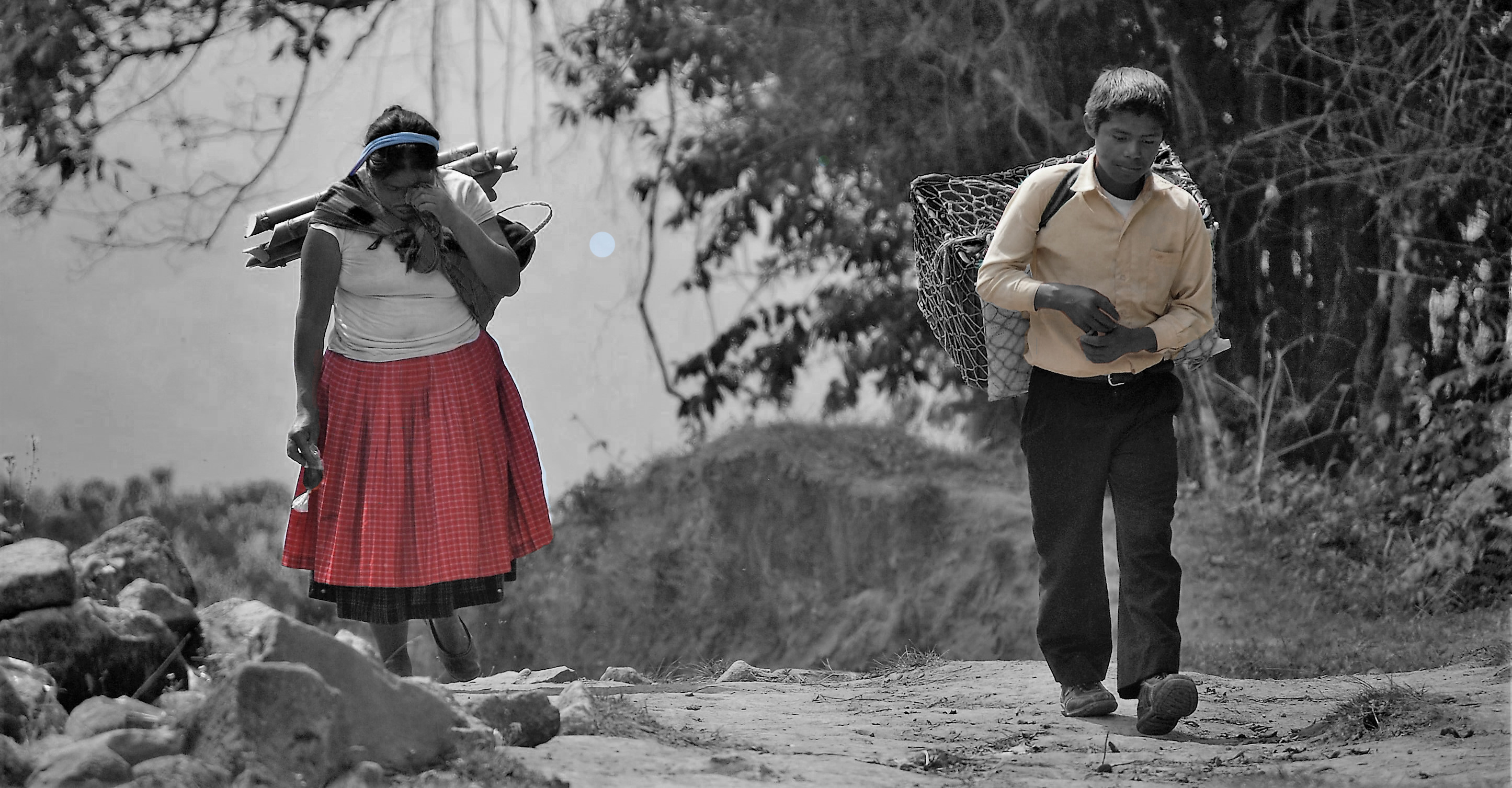 Estas fotografías son miradas desde dos espacios de esta territorialidad compartida, dos puntos de paso cotidiano que dan cuenta de la proximidad, de la no existencia real del límite, de la inexistencia, en muchos casos, de la conciencia de “estar en otro país”. Por un lado, el río, el Suchiate que en el último tramo del límite de Chiapas con Guatemala marca los espacios de “soberanía nacional” a la vez que, en el día a día, es un puente permanente y constante a través de balsas improvisadas que trasladan a personas y mercancías. Por el otro, el entorno mágico y mítico de culturas ancestrales conformado por el Volcán Tacaná (nuestra madre en lengua Maya Mam), que divide México y Guatemala, y el Volcán Tajumulco (nuestro padre en lengua Maya Mam), que juntos dan vida al llamado “camino de la línea”. En este punto se enmarca ese camino que une las dos principales localidades de la zona, Unión Juárez en México y Sibinal en Guatemala. A diario, hombres, mujeres, niños, niñas y mulas lo recorren subiendo o bajando la montaña con sus productos o sus compras y se convierte en una carretera ancestral de comunicación entre regiones.