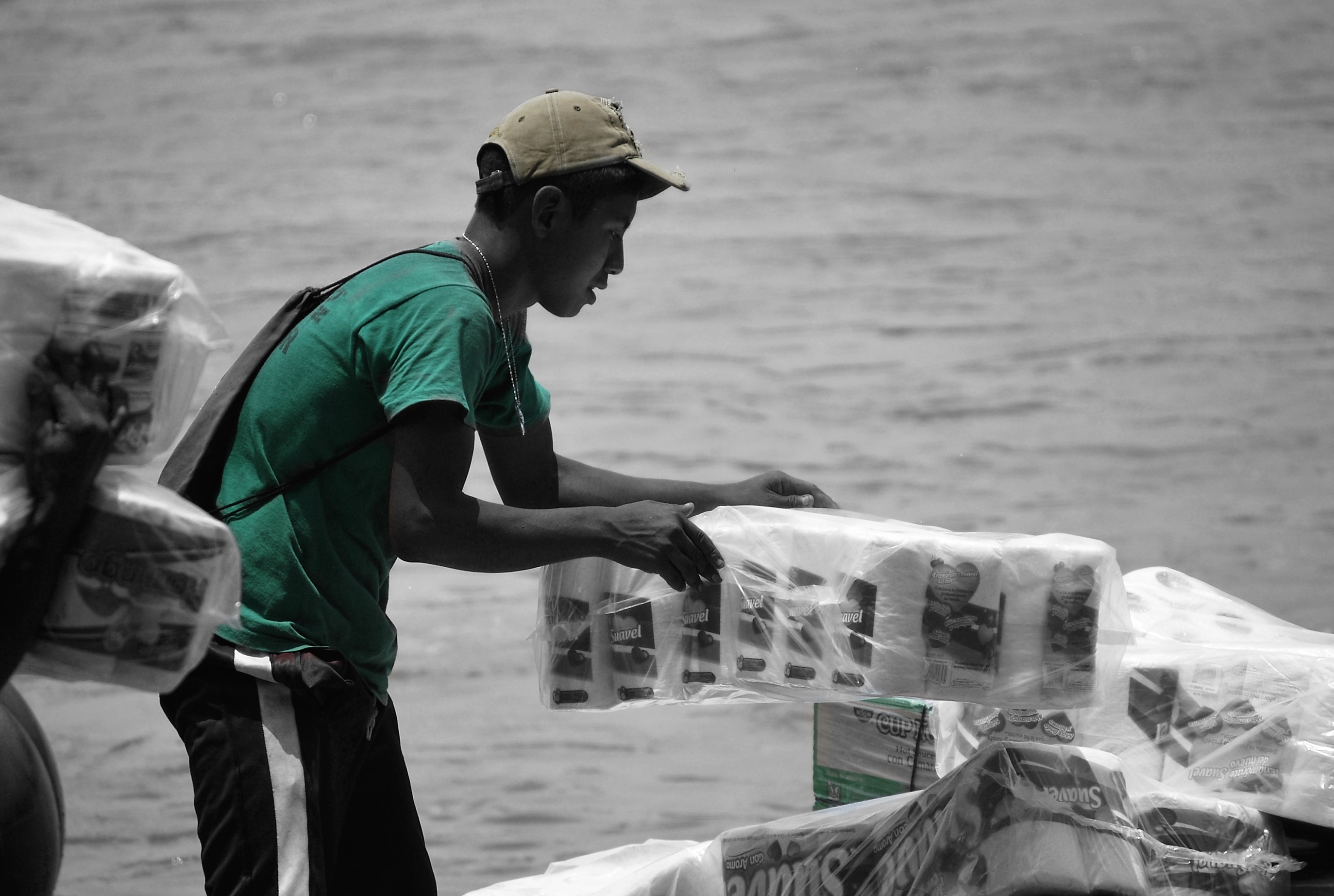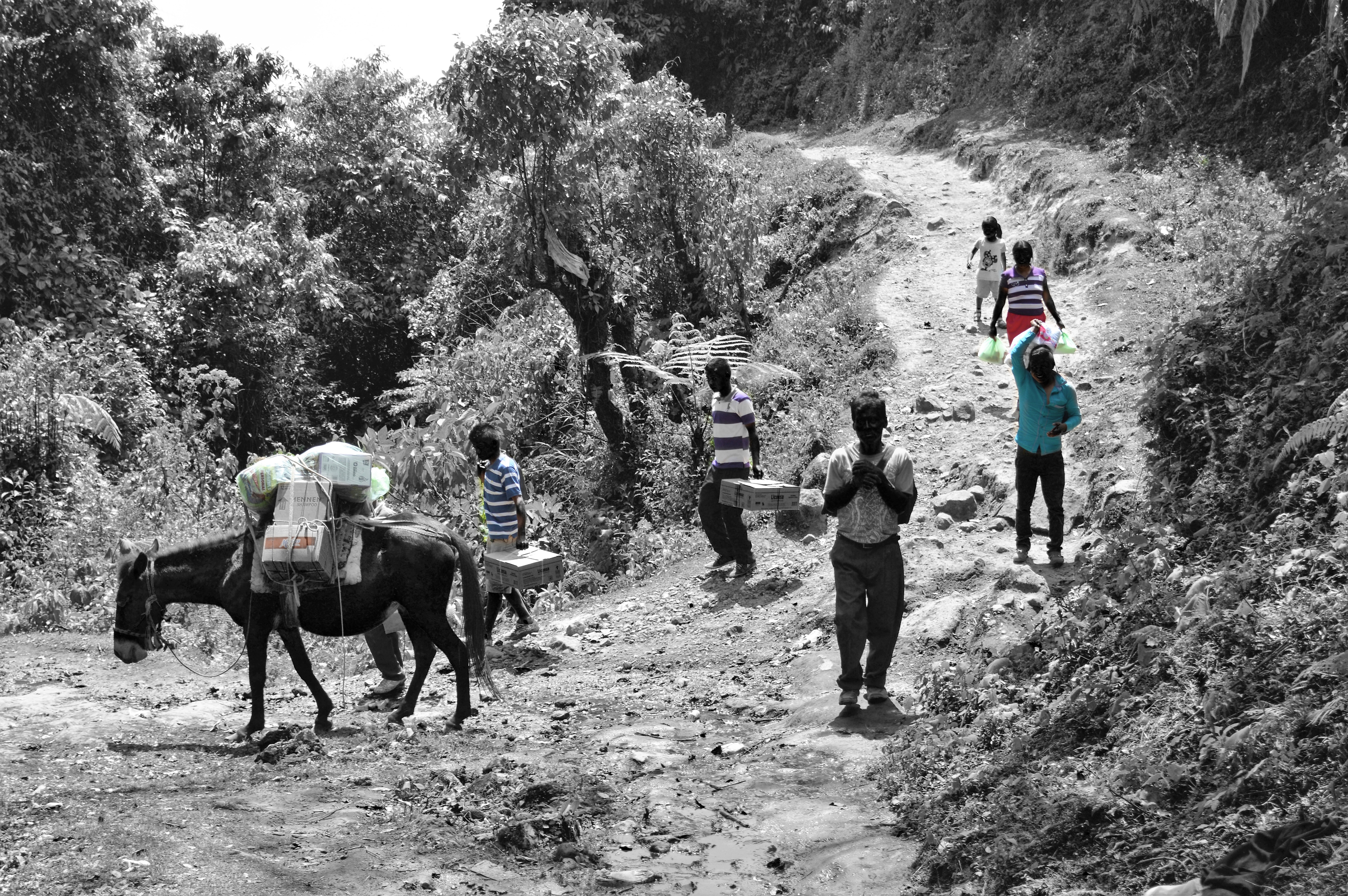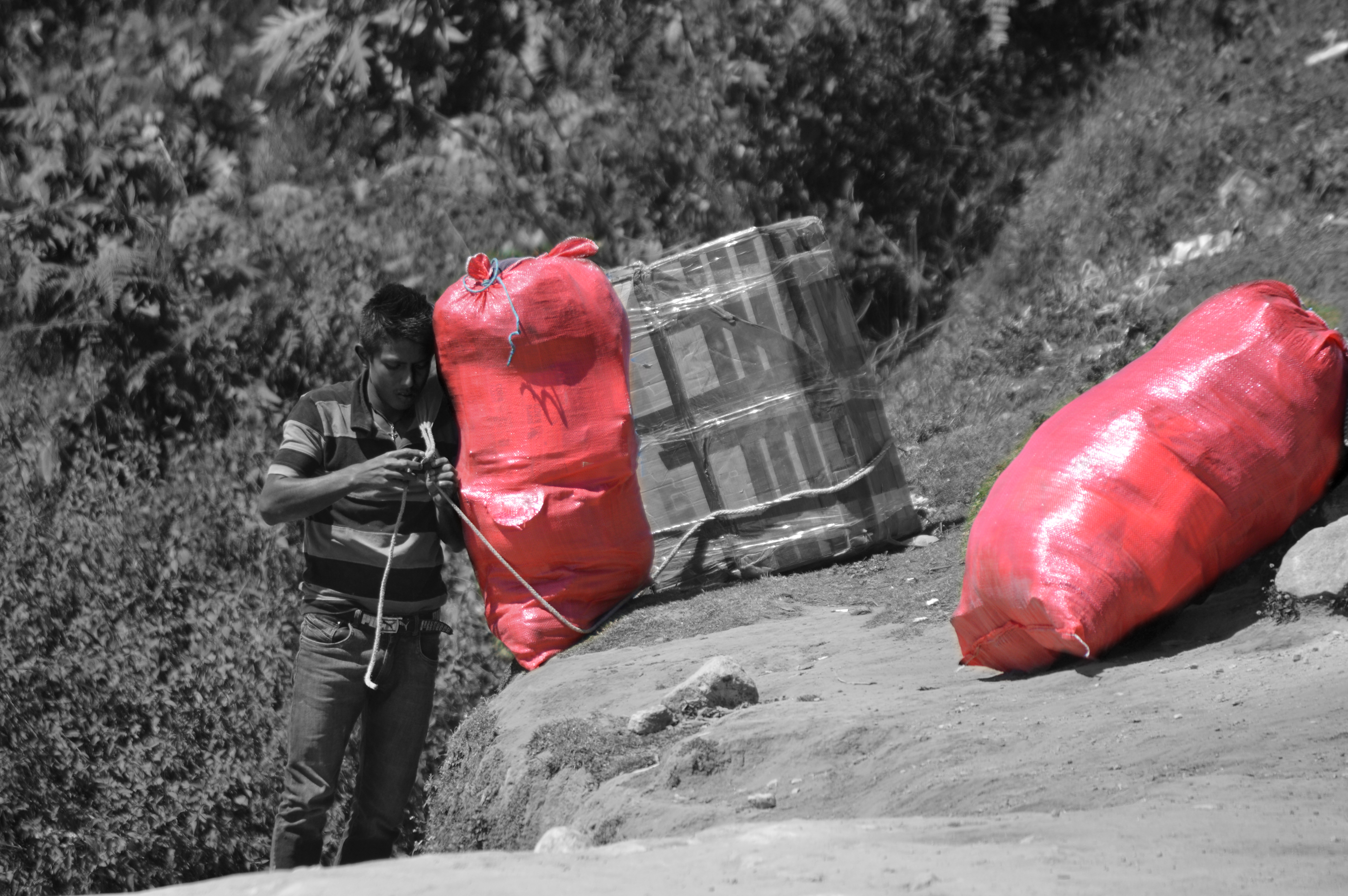 Estas fotografías son miradas desde dos espacios de esta territorialidad compartida, dos puntos de paso cotidiano que dan cuenta de la proximidad, de la no existencia real del límite, de la inexistencia, en muchos casos, de la conciencia de “estar en otro país”. Por un lado, el río, el Suchiate que en el último tramo del límite de Chiapas con Guatemala marca los espacios de “soberanía nacional” a la vez que, en el día a día, es un puente permanente y constante a través de balsas improvisadas que trasladan a personas y mercancías. Por el otro, el entorno mágico y mítico de culturas ancestrales conformado por el Volcán Tacaná (nuestra madre en lengua Maya Mam), que divide México y Guatemala, y el Volcán Tajumulco (nuestro padre en lengua Maya Mam), que juntos dan vida al llamado “camino de la línea”. En este punto se enmarca ese camino que une las dos principales localidades de la zona, Unión Juárez en México y Sibinal en Guatemala. A diario, hombres, mujeres, niños, niñas y mulas lo recorren subiendo o bajando la montaña con sus productos o sus compras y se convierte en una carretera ancestral de comunicación entre regiones.