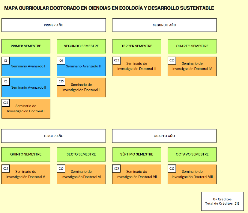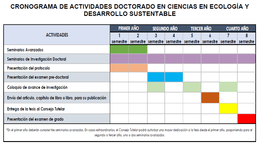 El Doctorado en Ciencias en Ecología y Desarrollo Sustentable tiene una duración de cuatro años (ocho semestres) y se desarrolla bajo un modelo tutelar. Esto significa que la formación se centra en la investigación, con el acompañamiento académico de un Consejo Tutelar que orienta el trabajo del o la estudiante a lo largo del programa. El programa requiere de dedicación exclusiva y de tiempo completo, con un compromiso mínimo de 40 horas semanales. Por tanto, no es compatible con el desempeño de otras actividades académicas o profesionales.