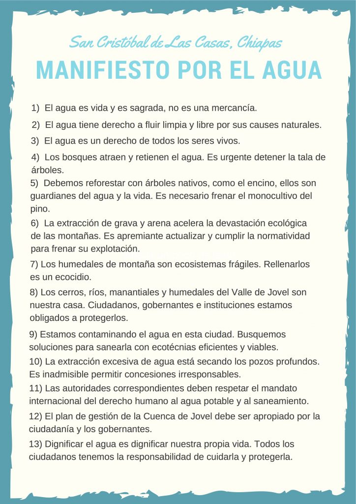 Ante esta situación, académicos de diversas instituciones y disciplinas, así como personas de organizaciones de la sociedad civil y público general interesado en estudiar y discernir las maneras más eficaces para contener, disminuir y mitigar los efectos del cambio climático, concluyeron que ante la insuficiencia de agua, la cual es cada vez más escasa y su mala calidad en el Valle de Jovel, su defensa y mantenimiento exige la creación de una nueva conciencia que parta de una nueva concepción en la relación del humano con el ambiente, para lo cual realizaron un manifiesto que señala: