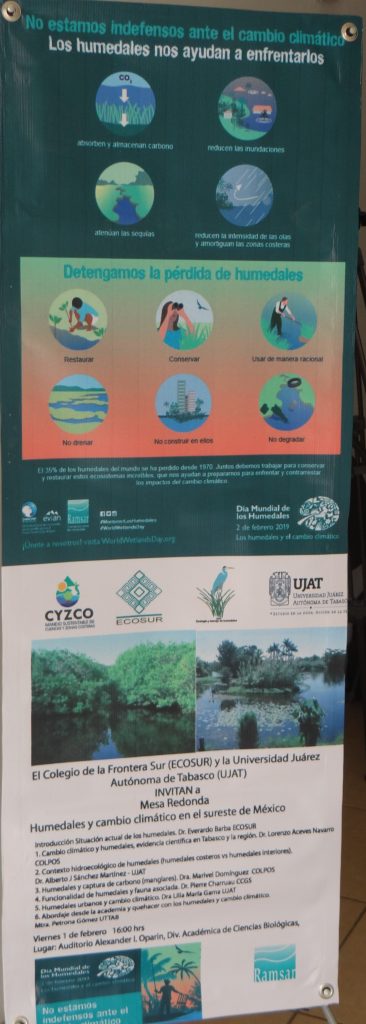 Por su parte la doctora Marivel Domínguez Domínguez del COLPOS expuso información sobre la importancia ecológica de la captura de carbono en los manglares y realizó una valoración de este servicio ambiental. Por su parte, el doctor Pierre Charrau del Centro del Cambio Global y la Sustentabilidad A.C. (CCGS) se refirió a la importancia de la función de los ecosistemas de humedales y el papel que tienen en el ciclo de vida de la fauna acuática, en especial de anfibios y reptiles. La doctora Lilia María Gama Campiño presentó una reseña de cómo se han perdido áreas de humedales en la ciudad de Villahermosa debido a diferentes causas, principalmente por cambio de uso de suelo, finalmente la maestra Petrona Gómez Zurita expuso cómo se podría abordar el tema de humedales y el cambio climático en la formación de recursos humanos y en general en el enfoque de la sociedad civil.