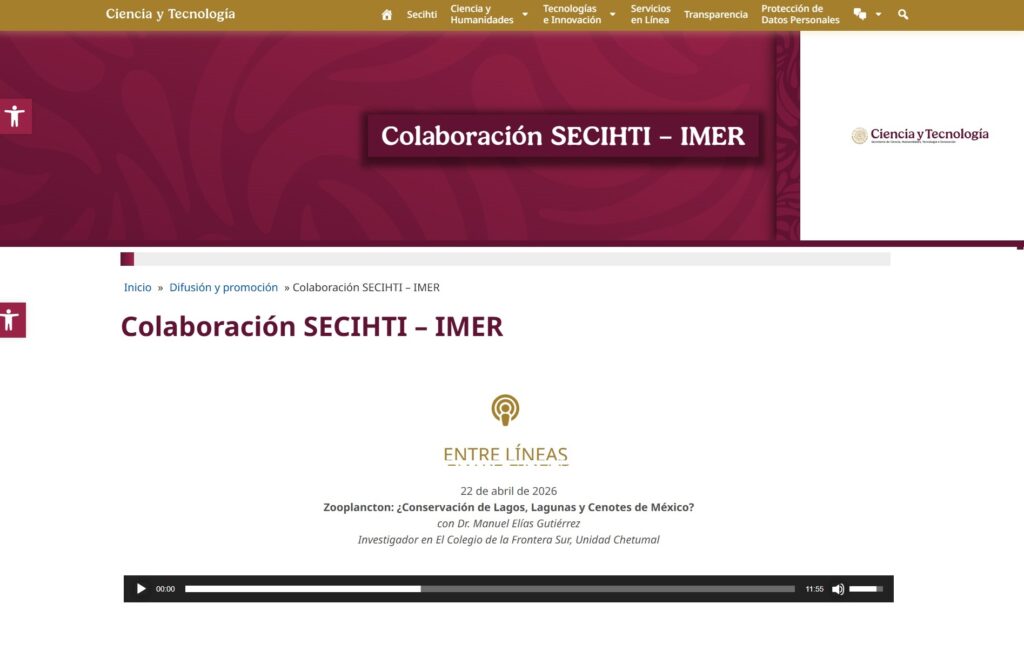Compartimos la entrevista que le realizaron a Manuel Elías Gutiérrez, investigador del Departamento de Sistemática y Ecología Acuática, Unidad Chetumal de Ecosur. En Entre Líneas, Minutos de Ciencia, el 22 de abril con el tema Zooplancton: ¿Conservación de Lagos, Lagunas y Cenotes de México?